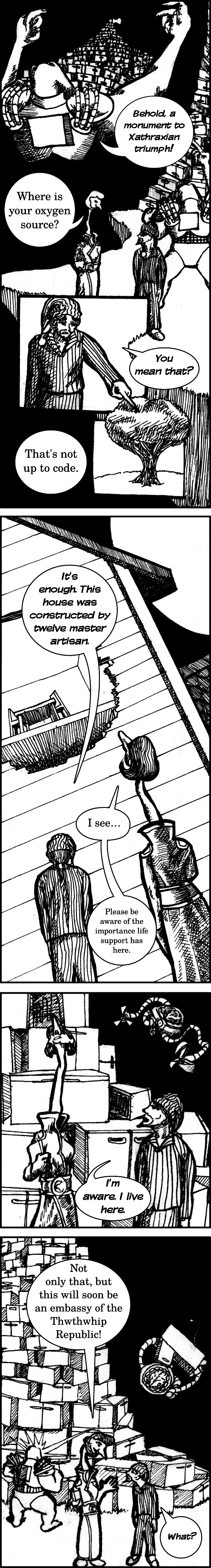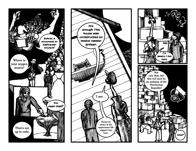 I'm really happy with this one. Part of the idea I was working with, is that by having dialogue which occurs off-panel, I can increase the situational awareness of the reader while also packing more information into the comic. Or so my thinking goes, at least.