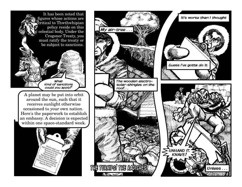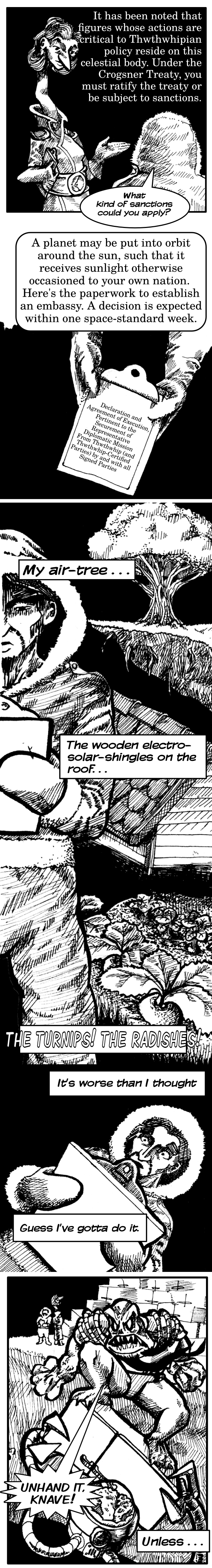 Now that I've had to draw it, I question whether it was a good idea to put a refrigerator tower in my comic, for it's quite tedious to draw. But now I've made my bed, and I must sleep in it. Come to think of it, though, just because you make your bed, it may not strictly follow that you absolutely must sleep there. If it does necessarily follow, however, I now have an airtight excuse to either stay longer at a hotel than I pay for, or get a free bed out of the dispute, when they try to kick me out.