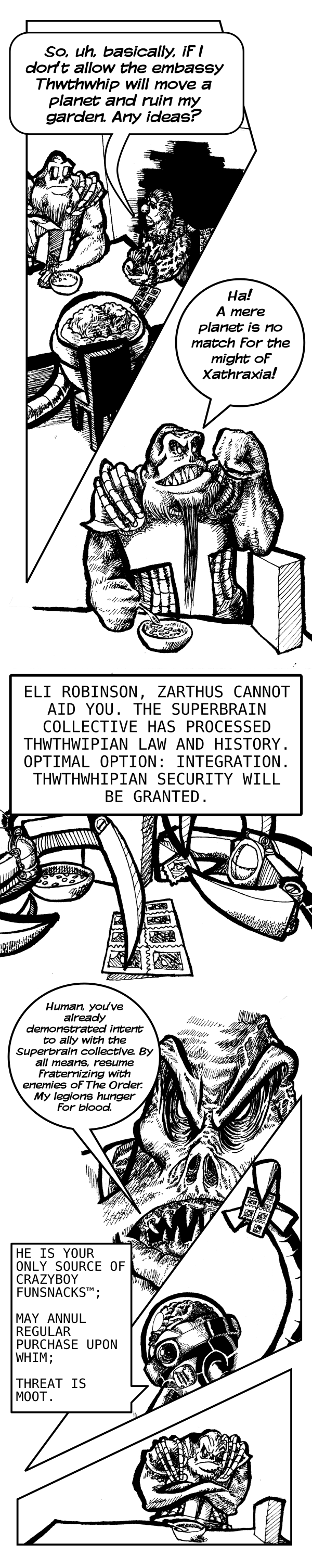 Speaking of shading, I've recently started inking with rOtring Isograph pens, and golly, they're a pleasure to hatch with. Their consistency makes those kinds of lines come out really well. Previously, for most linewidths, my multiliners were Copics, and I still have some I use. The difference appears to be that the Copics are capable of having a certain taper to their line widths, should you flick the pen a certain way while removing it from the paper from a stroke. Occasionally I miss this, but I prefer a lack of it when hatching, which is causing me to lean towards the rOtrings.