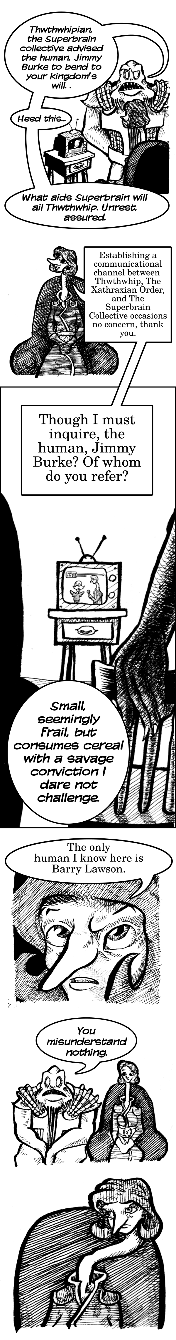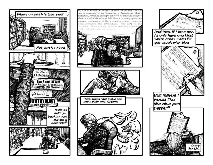 Speaking of pens, until now, I've put off getting a white gel pen. Now that I have one (a Uni-Ball Signo UM-153 Broad), I think it's becoming one of my most important tools. For this page, I haven't used it all that much, but I've inked some later comics, and it's super-useful (page 26 is where I think I am starting to use it more actively, due to a new paper upon which my ink smudges more easily). White inks, white-out, and gouache are things I've experimented with a tiny bit, but nothing really clicked for me. The humble white gel pen, possibly last idea I expected to find suitable, has been the most useful, by far.